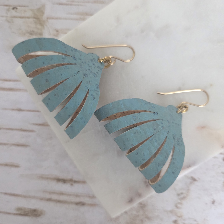 Light as a feather and full of dimension, these sculptural fan earrings are crafted from genuine Portuguese cork. Each pair is carefully shaped for a 3D effect that moves beautifully with you. The aqua hue adds a breezy, coastal touch, while the sustainable cork keeps them incredibly lightweight. This design is part of a limited series — also available in a version made from thrifted leather.