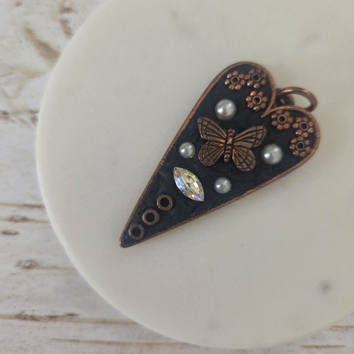 A mini work of art, this mosaic heart pendant is part of the French Ostrich “Voyageur” collection. A copper plated bezel sports a butterfly, faux pearls and tiny copper tidbits, inlaid into a black background.