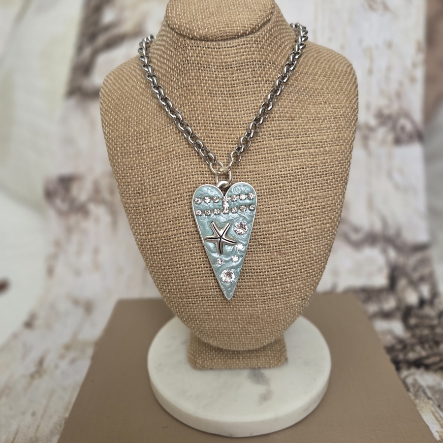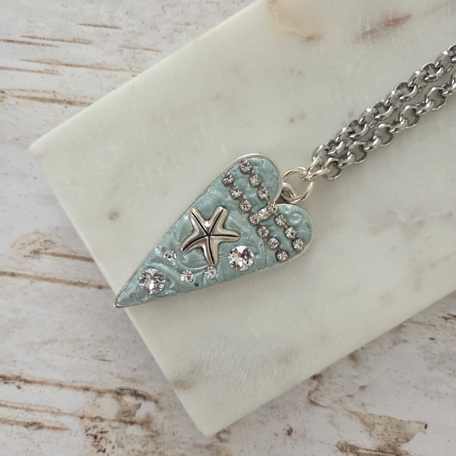 A tribute to the sea, this heart pendant is set in pale aqua epoxy clay with a touch of sparkle and a small sea star nestled inside.