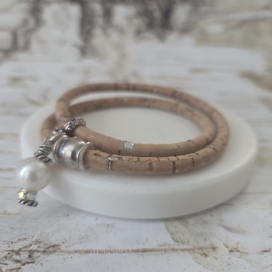 Introducing our versatile cork accessory: a bracelet that effortlessly transforms into a chic choker! Crafted with a genuine freshwater pearl complemented by a Czech crystal rondelle and suspended from a silver bail, this piece will be a conversation-starter.