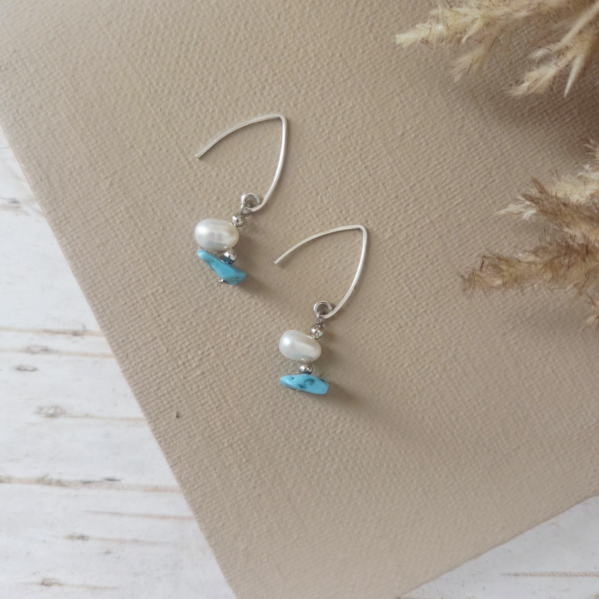 - Materials: Fresh water pearls and turquoise, handmade sterling silver ear wires.