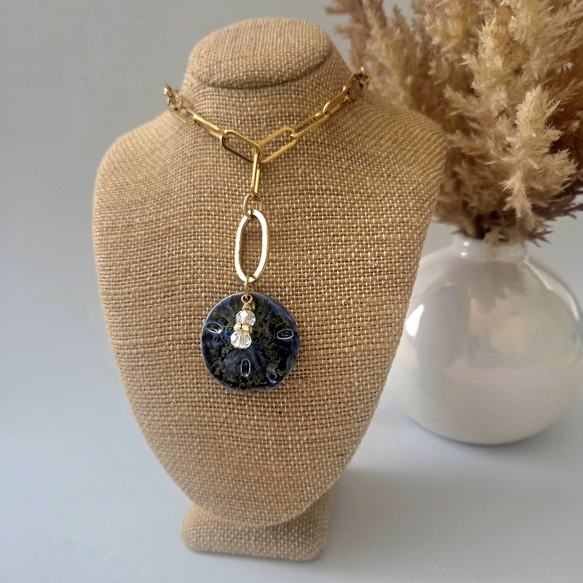 This handcrafted ceramic sand dollar pendant brings an easy, collected feel to a modern necklace. Shaped with soft, organic contours and finished in layered blue tones, the ceramic element has the kind of depth and variation that only comes from working by hand. Two crystal beads and a crystal rondelle add a subtle glint of light and texture.