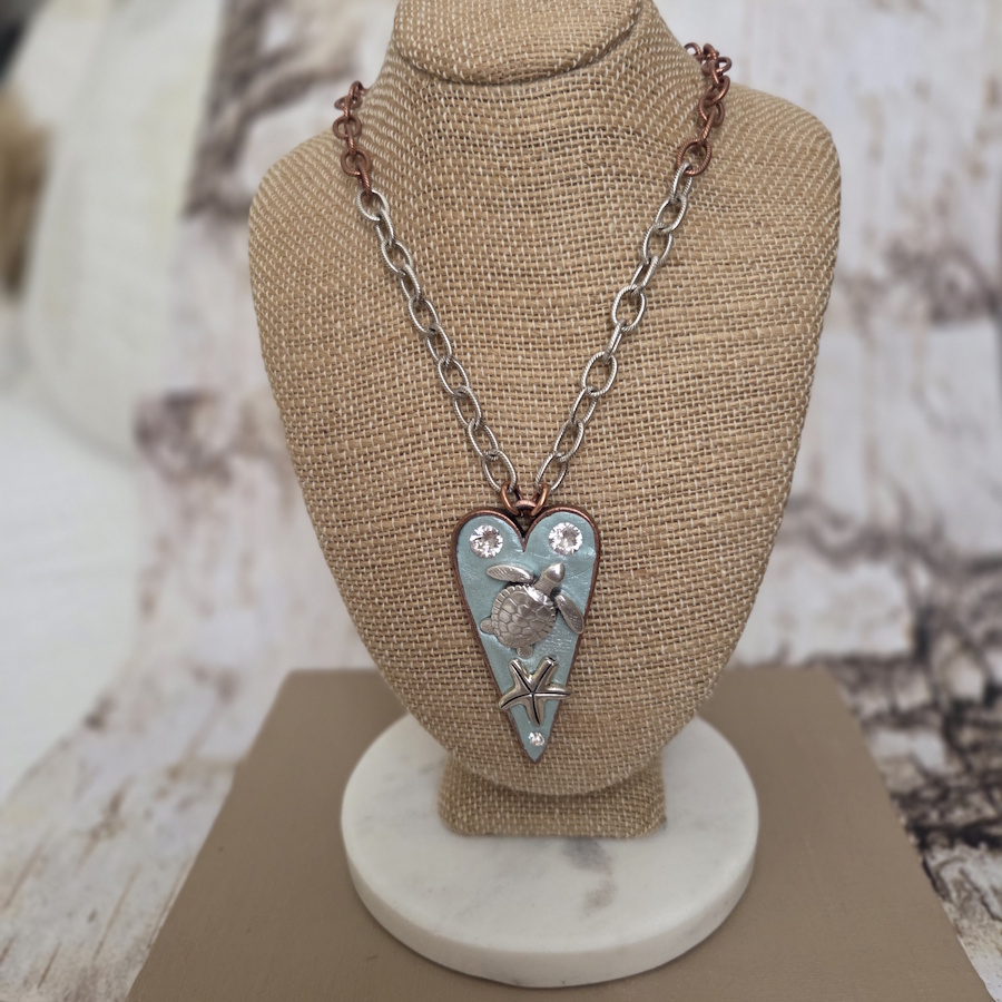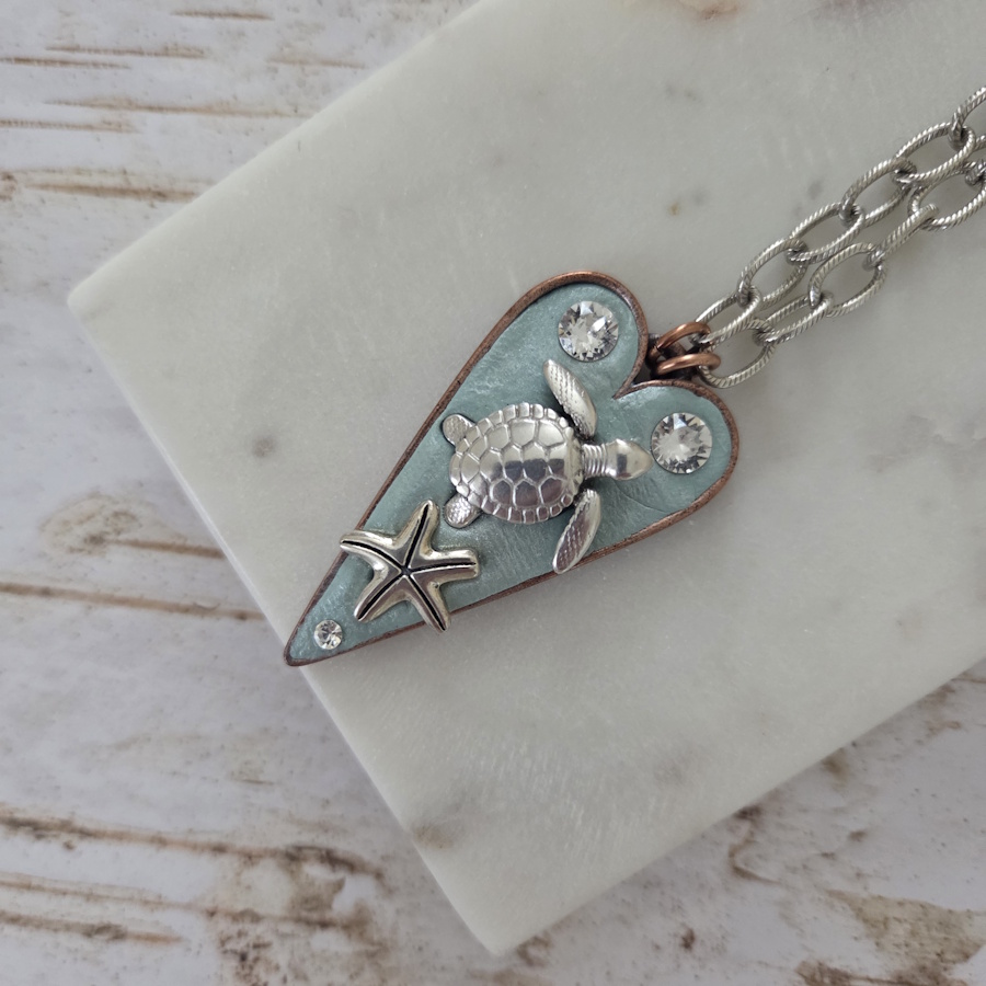A tribute to the sea, this heart pendant with a turtle and a sea start is set in pale aqua epoxy clay with a touch of sparkle.